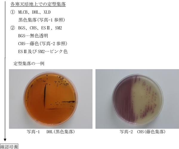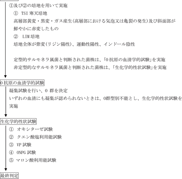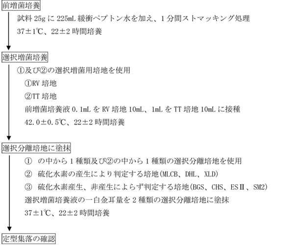 微生物検査室 1 はじめに昭和34年厚生省告示第370号「食品、添加物等の規格基準」の食肉製品のうち、非加熱食肉製品、特定加熱食肉製品及び加熱食肉製品(但し、加熱殺菌した後容器包装に入れたもの)、並びに食鳥卵(但し、鶏の液卵を殺菌したもの)の成分規格としてサルモネラ属菌の規格が設定されている。これまでサルモネラ属菌の試験法は、食肉製品については平成5年3月17日付け厚生省生活衛生局長通知「衛乳第54号」、食鳥卵(殺菌液卵)については平成10年11月25日付け厚生省生活衛生局長通知「生衛発第1674号」でそれぞれ定められていたが、平成27年7月29日付け厚生労働省通知「食安発0729号第4号」で黄色ブドウ球菌の試験法と合わせて改正された。 2 試験法について試験法を図-1に示す。