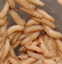 図1 アメリカミズアブの成長段階(左から卵塊、幼虫、成虫)