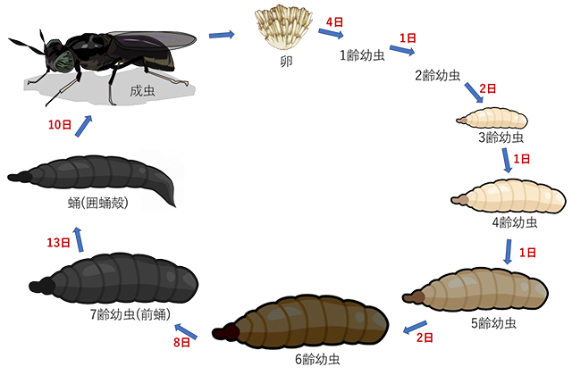 3.アメリカミズアブの生物学的特徴ミズアブは、ハエ目ミズアブ科に属する昆虫であり、広義のハエの一種です。カイコやカブトムシと同様に、ライフサイクルに蛹(さなぎ)の段階を含む完全変態昆虫ですが、冬季に休眠することがなく、年間を通じて繁殖を続けます(図2)。原産地はアメリカ大陸で、現在では日本を含む世界各地に分布しています。卵は2mm弱と非常に小さく、孵化後は何度も脱皮を繰り返して最大体長約2cmの成熟幼虫に成長します。その後、蛹を経て成虫の黒色のハエに羽化します。従来、成虫は摂食しないと考えられていましたが、近年の研究で栄養を摂取することが示されています。また、「アブ」という名称から刺す虫という印象を受けるかもしれませんが、ハチのような針を持たず、刺すことも噛むこともありません。さらに、病原菌の媒介リスクが低く、農作物を荒らすこともないため、極めて安全な昆虫です。幼虫期間は約2週間で、一世代のライフサイクルは常温で、約2か月間で完結します。この短い成長サイクルが、食品廃棄物の迅速な処理に有効です。