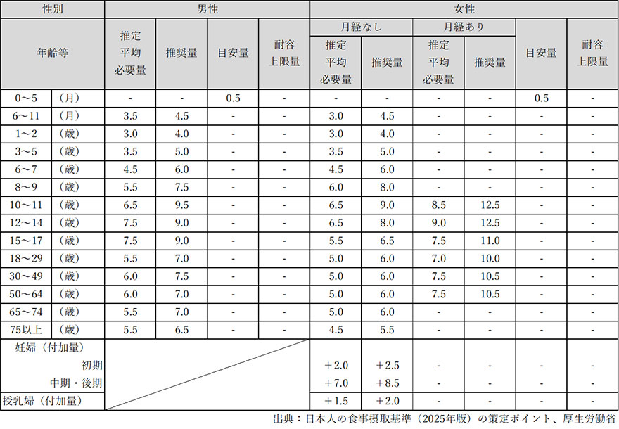 日本人の食事摂取基準(2025年版)では、成人男性で約7.0mg/日、成人女性で約10.5mg/日の鉄摂取が推奨されている。妊娠期や授乳期にはさらに多くの鉄が必要である。年齢やライフステージごとの推奨量を表1に示す。食品表示基準では、鉄は栄養成分表示の対象であり、鉄強化食品やサプリメントも広く利用されている。自分に必要な鉄の量を知り、どのように摂取するかを理解することが、健康維持のために重要である。