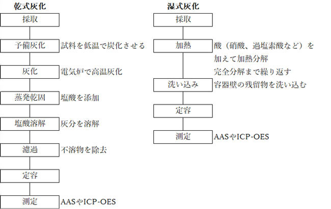 食品分析の主流である原子吸光光度法及びICP発光分析法の分析フローチャートを図1に示す。
