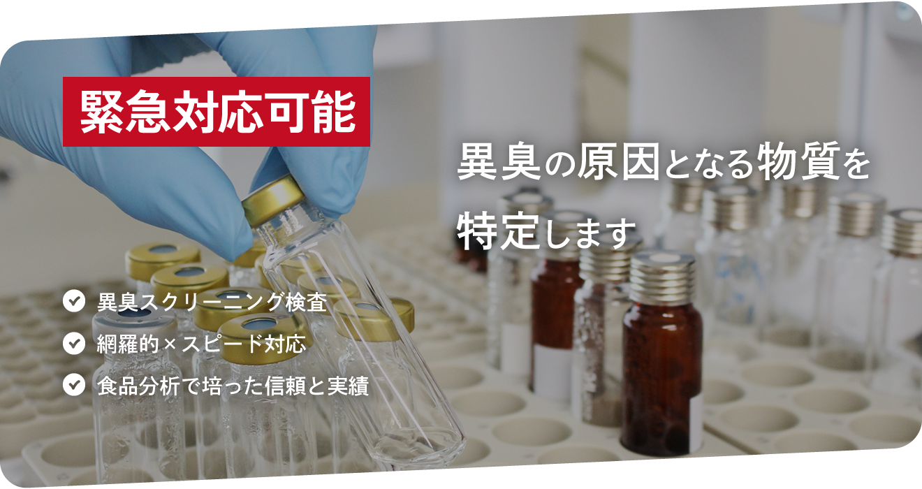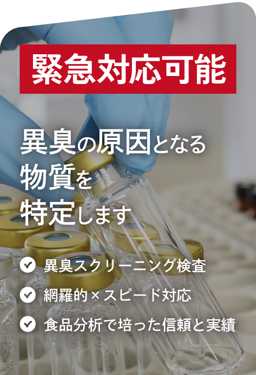 「異臭スクリーニング150」は、食品に含まれる主要な異臭原因となる150成分をGC-MS(ガスクロマトグラフ質量分析)により網羅的に分析し、異臭の原因追究をサポートする検査サービスです。